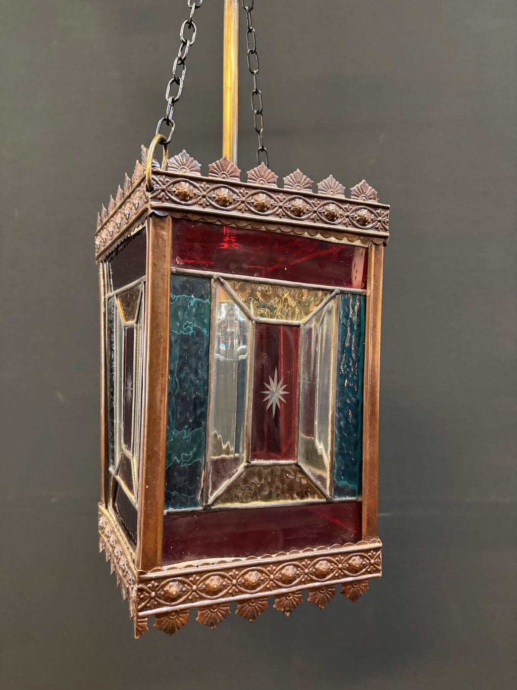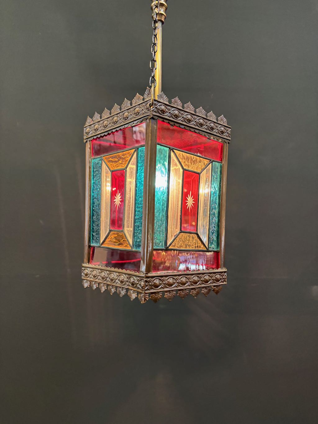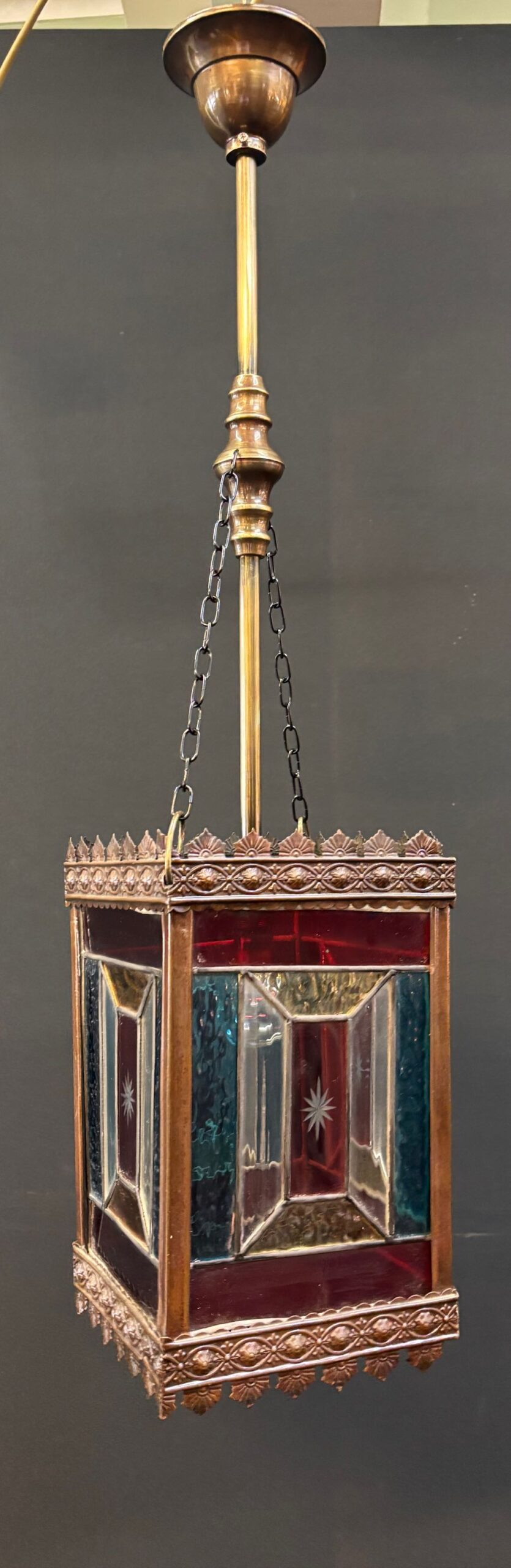 Victorian petite brass lead light lantern in re wired condition