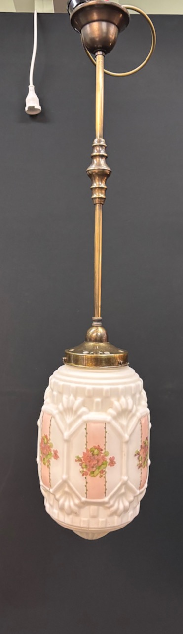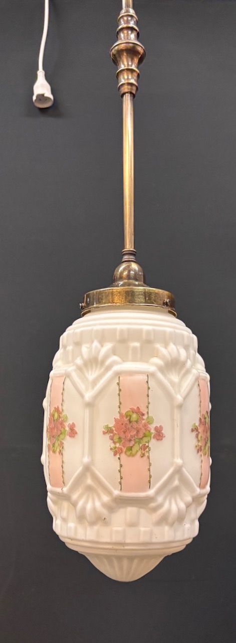 Original milk glass hand painted pendant light with re wired solid brass antique bras rod