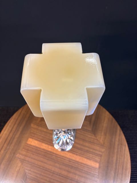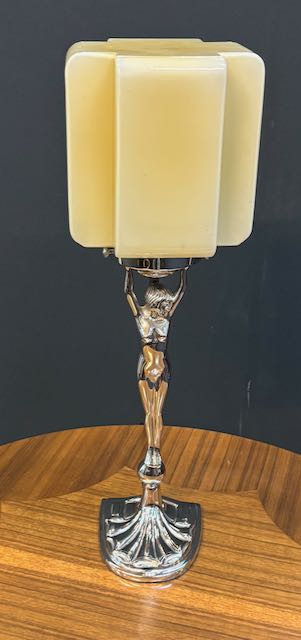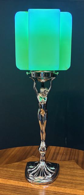 Solid brass chromed Art Deco Style Diana lamp in re wired condition with original Art Deco Uranium shade